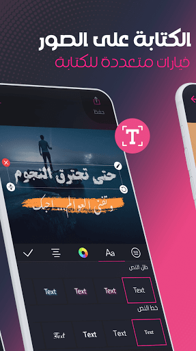 • يمكنك تحويل أفكارك وكلماتك الملهمة الى صور تنبض بالحياة مع ميزة الكتابة على الصور في برنامج محرر الصور الاحترافي وذلك مع مجموعة من الخطوط العربية والانجليزية مدعومة بخيارات تخصيص متعددة مثل التحكم في حجم النص ولونه وكذلك إضافة ظل للنص وإضافة مؤثرات للنصوص.