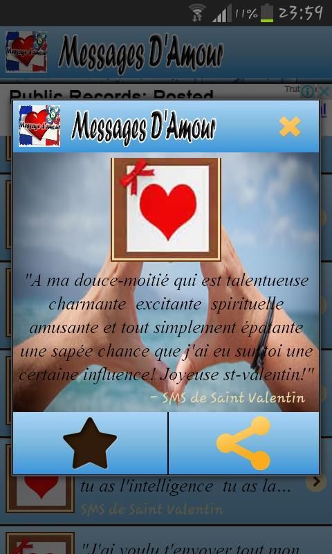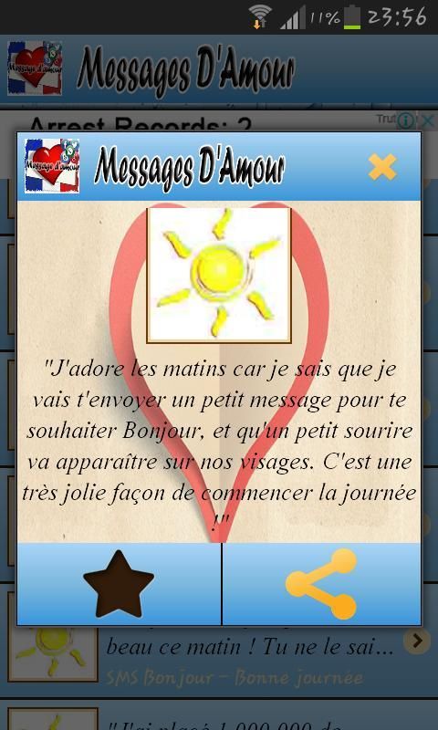 التعبير عن مشاعرك وإرسال رسالة قصيرة من الحب في الفرنسية لينة جدا لحبك أصبح من السهل جدا مع هذا التطبيق، لم يعد لديك لكتابة الرسائل القصيرة SMS لحبيبتك، يمكنك ببساطة فتح التطبيق، اختر الرسالة التي ترغب في إرسال والهيب القيام به!