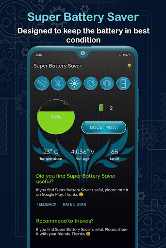 Smart Battery Saver – Battery Optimizer Boost your mobile battery life, Monitor its voltage and temperature, shows you every little detail about your phone's battery, Boost your mobile battery life! Monitor battery levels while applying battery-saving profiles that turn off those pesky apps eating up your battery power. Now you can save energy and make the most out of your phone or tablet. Shut down unnecessary apps and maximize your phone battery power every single day.