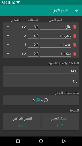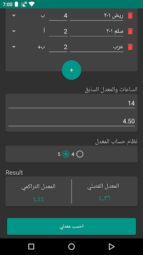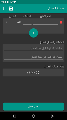 انقر على علامة الزائد وبعدها قم بإدراج بيانات المقرر. قم بعدها بإضافة المقررات الاخرى. بعد ذلك قم بإدخال عدد الساعات السابقة والمعدل السابق. اخيراً اختر نظام المعدل المعمول به في جامعتك ثم انقر على زر احسب.