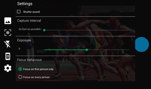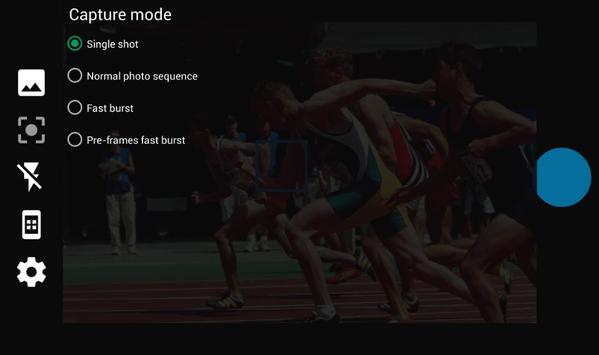 - Pre-frames fast burst: Like fast burst but saving pictures previewed "Frame buffer" seconds prior to pressing the capture button.