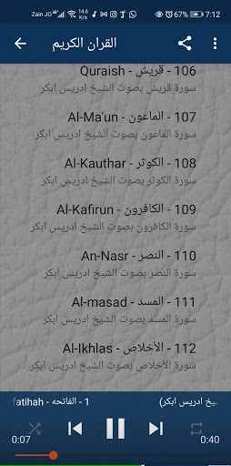 يتيح لك تطبيق ( إدريس أبكر - القران الكريم كامل) الاستماع الى التلاوة العطرة بصوت الشيخ