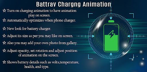 بطارية أنيقة شحن البطارية Vitality & amp ؛توفر شاشة الشحن الرسوم المتحركة طريقة سريعة وسهلة لإنتاج عرض شحن بطارية شاشة مذهل مذهل.الآن من السهل تحديد موضع شحن بطارية الهاتف على سفنك وشاشة منزلية.يستمر لأطول فترة ممكنة.ماذا يمكن ان يفعل؟في الواقع ، كل شيء بسيط بشكل مؤكد ، تحتاج فقط إلى تعلم كيفية التحكم في موضع شحن البطارية أو شحن الشحن ، وفصل الهاتف عن الطاقة في الوقت المحدد ووضعه في الشحن السريع في الوقت المناسب.كما شاهدت عرض شحن هائل على شاشة الهاتف المحمول.تعرف على معلومات البطارية ، ودرجة حرارة البطارية ، والجهد ، والتكنولوجيا ، والصحة ، وفرصة البطارية لجهازك المحمول.تعتبر شاشة cinch المتحركة تطبيقًا أنيقًا لضبط المنبه عندما تكون طاقة بطارية الهاتف المحمول ممتلئة.بحيث يمكنك شحن هاتفك المحمول ولا تنفد من البطارية ، إنها أداة رائعة للحفاظ على صحة البطارية.قم بتعيين شاشة Vitality الشحن القابلة للتخصيص أثناء تغيير هاتفك المحمول.لا تزعج نفسك عن طريق التمرير لأعلى ولأسفل فقط صمام على موضوع الشحن الحيوي الذي تحبه وتطبيقه.في بعض الثواني ، شاهدت حيوية شحن أنيقة على شاشتك.إنها حقًا أداة رائعة لتخصيص شخصيتك المحمولة.يمكن أيضًا تخصيص كل هذا من خلال اختيارك لألوان الكتب المدرسية والخلفيات.هاتفك المحمول مظهرًا متواضعًا.
