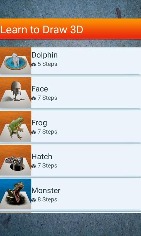 هذه التطبيقات هي خطوة خطوة تعليمات التي سوف يعلمك تعلم كيفية رسم 3D. مثل مدرس فن الشخصية، وسوف يعلمك كيفية رسم رسومات (خطوة خطوة) من صور مختلفة. وهو يشتمل على مجموعة كبيرة من الرسومات مصنفة حسب مستوى الصعوبة.
