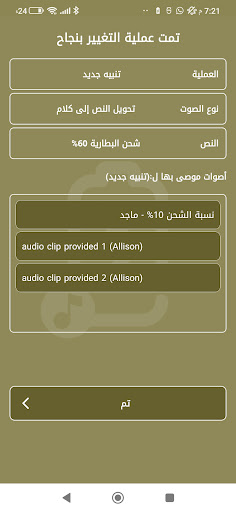 * يمكنك تخصيص مقطع صوتي بمدة معينة موضحة داخل التطبيق وتخصيصها كرد فعل.