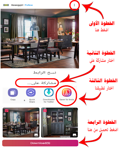 انقر فوق مشاركة واختر تطبيقنا ( حفظ من انستا ) من القائمة
