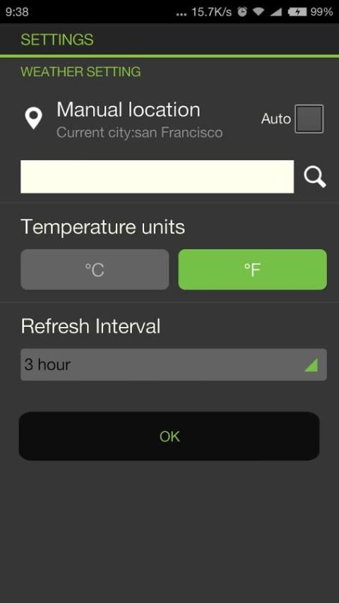 أوتوماتيكية الفاصل الزمني للتحديث الطقس: 15 دقيقة، 30 دقيقة، 1 ساعة، 3 ساعات، 6 ساعة و يوم واحد