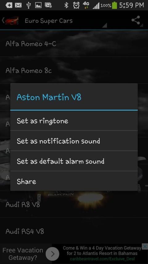 - Set as ringtone, sms, notification or alert (tap and hold the car sound you like)