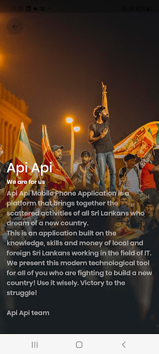 API API Mobile App هو منصة تجمع الأنشطة المتناثرة لجميع سريلانكيين الذين يحلمون بدولة جديدة.يسهل التطبيق سريلانكيين في جميع أنحاء العالم للالتقاء ومساعدة بعضهم البعض في الأوقات الصعبة.