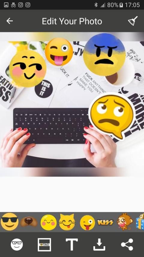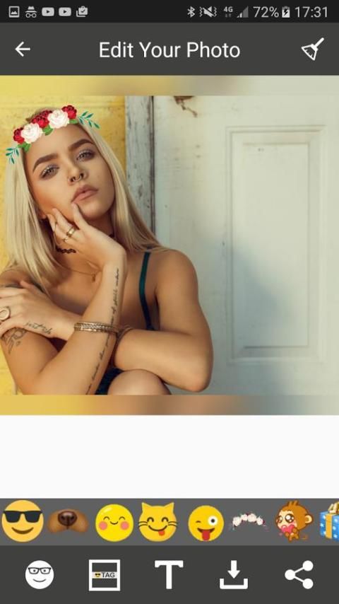 تخطيطات الكولاج. الرموز التعبيرية والمرشحات في هذا التطبيق يمكن اختيار، وأضاف على صورة شخصية. على بعد خطوات قليلة، وآثار حية تظهر على الموافقة المسبقة عن علم. بالإضافة تتوفر العديد من الفلاتر وملصقات المتاحة، مثل الوجه هزلي، وجه القط، أرنب وجه، قوس قزح، عيون الحيوانية، حفلة تنكرية الكاميرا، رمز تعبيري، والدموع، والنص، وهلم جرا. ما هو أكثر من ذلك، كل هذه الحرية.