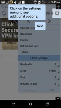Free VPN Flash Browser for Android provides both privacy and anonymity for users surfing websites. Its provides both a normal browsing mode and a VPN mode. The VPN mode allows users :