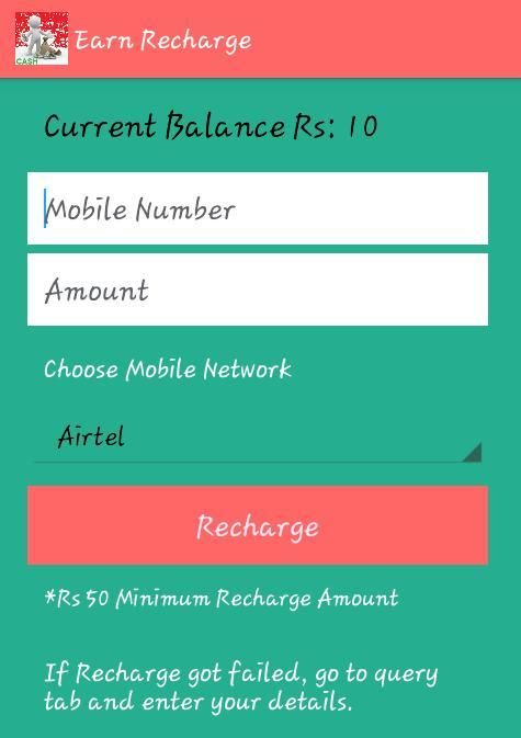 وزمن التكلم مجانا أو التعبئة للهاتف النقال أو Paytm النقدية مساعدتك في الحصول على مصروف الجيب الحرة الخاصة بك والتي يمكن استخدامها لإعادة الشحن المجاني للجوال / أسبوعية زمن التكلم مجانا لتحميل التطبيقات ويملأ المسوحات. وأنك لن تضطر لدفع ثمن التعبئة للهاتف النقال الخاص بك مرة أخرى. يدعم التعبئة للهاتف النقال لشبكات المحمول التالية: ايرسل، ايرتل، فكرة، والاعتماد سى دى ام ايه، والاعتماد GSM، تاتا دوكومو وفودافون، حلقة موبايل، BSNL، Uninor، فيديوكون، MTS.