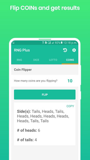 Need to quickly settle a 50/50 bet? Then use Random Number Generator to flip a coin for you! Flip as many coins as you want whenever you want. The app also saves your preferred number of coins to flip for quick reuse and sums up the # of heads flipped and the # of tails flipped for you in the results box as well. And yep, you can copy to clipboard these results too.