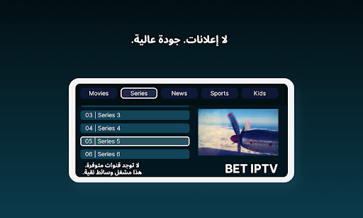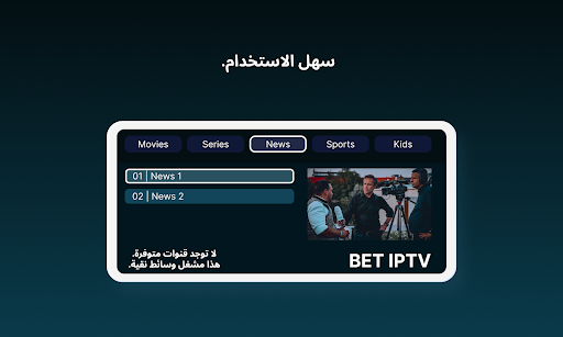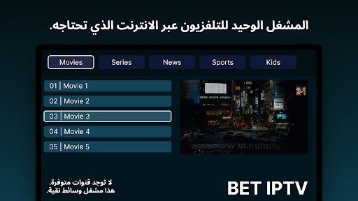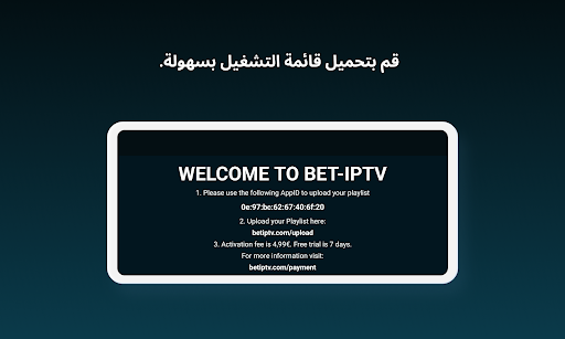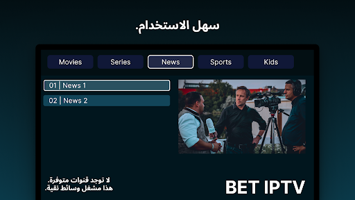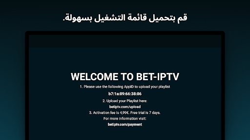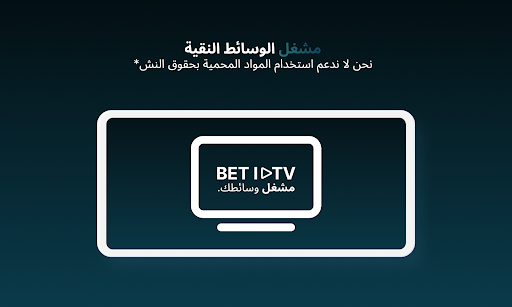 *لن يتم تقديم أي معلومات حول القنوات أو القوائم التشغيل وسيتم تجاهل أي طلبات تتعلق بالقنوات أو القوائم التشغيل. كما أننا في BET IPTV لا ندعم استخدام المواد المحمية بحقوق الطبع والنشر في تطبيقنا.