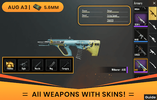 Aug A3، Groza، M416، Beryl M762، AKM، MK47 MUTANT، QBZ-95، M16A4، Scar-L، G36C