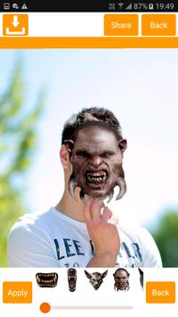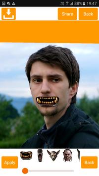 You select your photo from camera and gallery and adjust this Werewolf Photo Editor mask on your face and make your photo to horror.