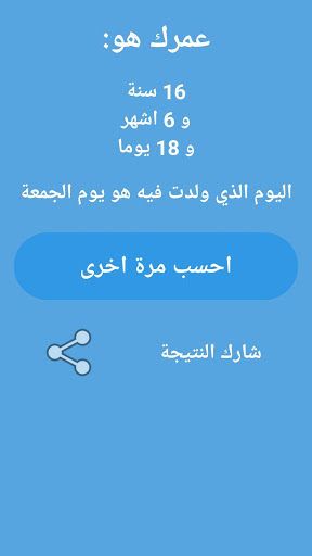 هذا التطبيق الجميل يحسب عمرك مجانا ، كل ما عليك فعله هو إدخال يوم ميلادك وسوف يظهر لك أيضا اسم ميلادك ، لذلك استمتع به وشاركه مع أصدقائك!