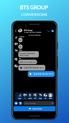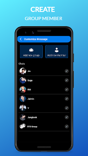 BTS Prank Chat Messenger! (Simulator) التطبيق يحتوي على تطبيق Messenger العادي.هنا سيتم كتابة الرسائل المرسلة والرسائل المستلمة كلاهما.وأيضا إنشاء دردشة جماعية لأصدقائك.