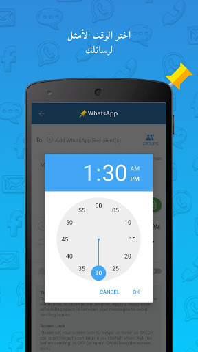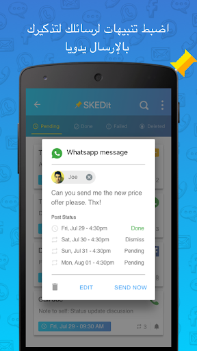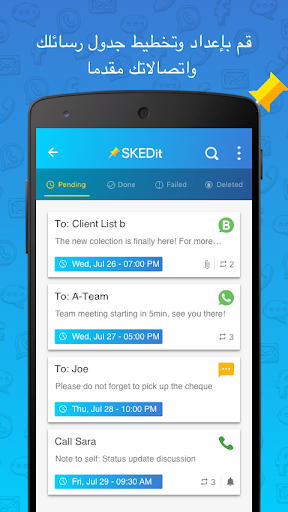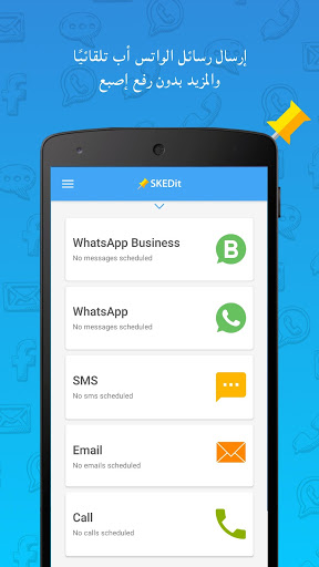 SKEDit تطبيق للجدولة مجاني وسهل الاستخدام يتيح لك جدولة الرسائل النصية وإرسال رسائل البريد الإلكتروني التلقائية وجدولة مشاركات فيسبوك ورسائل واتساب وإرسال المكالمات - كل ذلك خلال عدم استعمالك للهاتف!