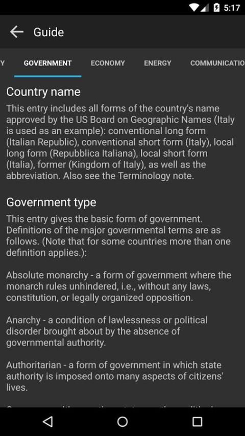 هذا التطبيق المجاني لتصفح كتاب حقائق العالم، ودليل من قبل وكالة الاستخبارات المركزية أعدت للاستخدام من قبل مسؤولي الحكومة الأمريكية.