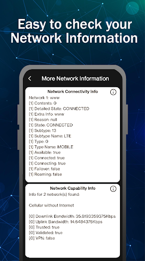 جميع المعلومات والتفاصيل متوفرة مثل معلومات SIM ومعلومات WiFi ومعلومات الشبكة واستخدام البيانات وسرعة الإنترنت.