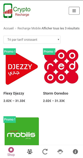 قم بشحن هاتفك المحمول نحو Djezzy، Ooredoo ، Mobilis وشبكة الإنترنت الخاصة بك نحو ايدوم و حتى مختلف الفاتورات كسونلغاز و إتصالات الجزائر باستخدام PayPal و Bitcoin و عملات رقمية أخرى بأمان أينما كنت نحو الجزائر