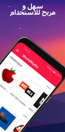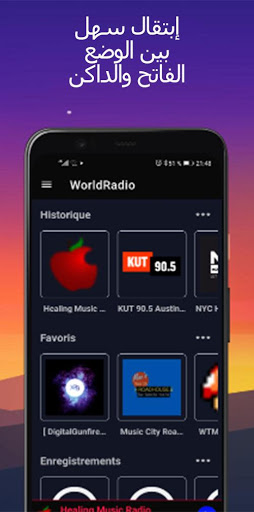 استيقظ على إيقاع الراديو المفضل لديك. اضبط منبهًا للراديو المفضل لديك. سوف يوقظك راديو العالم في ذلك الوقت ويبث الراديو الخاص بك.