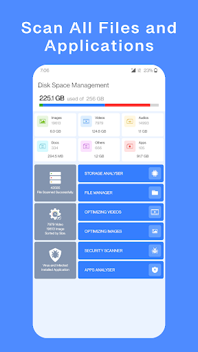 Clean storage to make free space with compress and optimize videos and images, you can delete unusable application and files sorted by size.