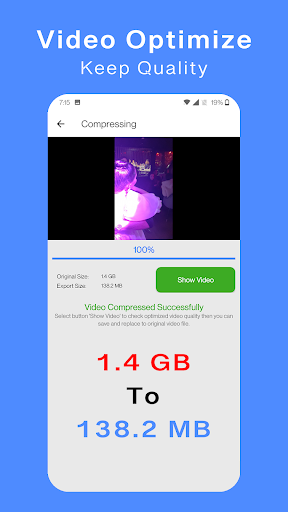 Video file with "1.4 GB" size after optimized update to "138.2 MB" and about "1.3 GB" free space made to my storage just with one file.