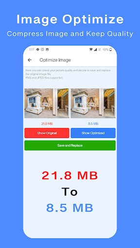 Image file with "21.8 MB" size after optimized update to "8.5 MB" and about "13.3 MB" free space made to my storage just with one file.
