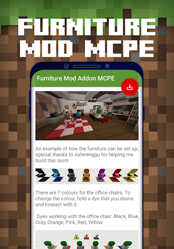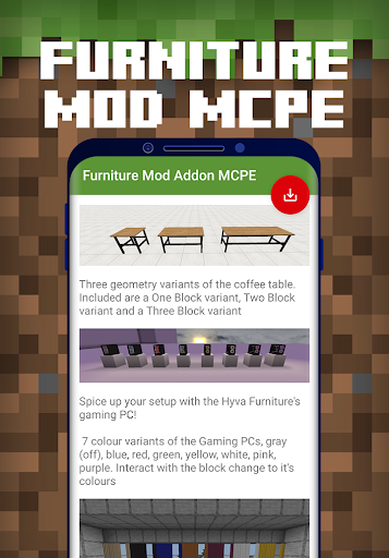 Furniture Mod for Minecraft PE هو محتوى مجاني قابل للتنزيل ل MINECRAFT Pocket Edition Game، حيث يمكنك تنزيل وتثبيت أحدث وتركيب الأثاث Hyva تلقائيا في عالم ماين كرافت الخاص بك.