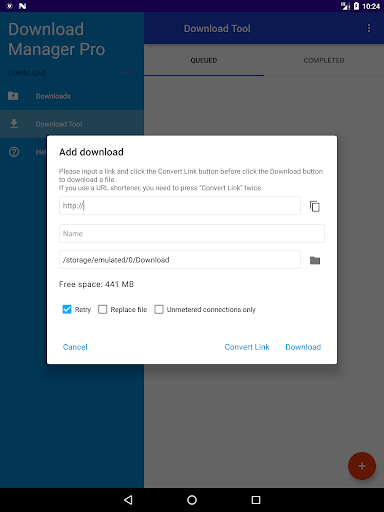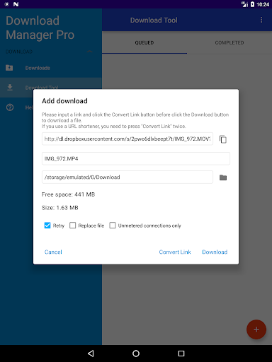 ما عليك سوى إطعام Dropbox / Google Drive Link Link في الحصول عليه للحصول على رابط أقصر، والذي يمكنك إدخاله في التطبيق. ستقوم بعد ذلك بالضغط على "تحويل الرابط" مرتين قبل الضغط على التنزيل. إذا قمت فقط بإدخال رابط Dropbox أو Google Drive، فلن تضطر فقط إلى الضغط فقط على "تحويل الرابط" مرة واحدة.