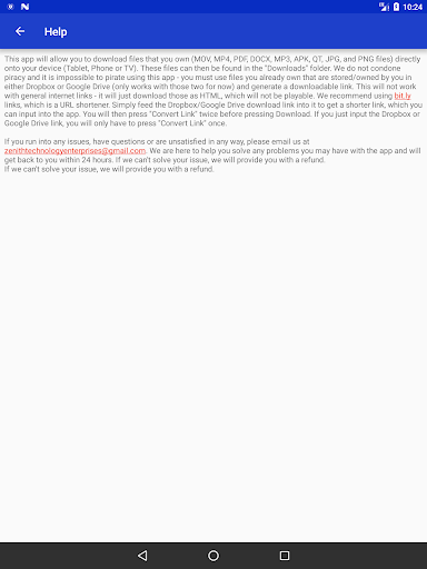 نحن لا نتغاضي القرصنة، ومن المستحيل القراصنة باستخدام هذا التطبيق - يجب عليك استخدام الملفات التي تمتلكها بالفعل التي يتم تخزينها / مملوكة لك في إما Dropbox أو Google Drive (يعمل فقط مع هذين الشخصين الآن) وتوليد رابط قابل للتنزيل. لن يعمل هذا مع روابط الإنترنت العامة - سيقوم فقط بتنزيل تلك ك HTML. نوصي باستخدام الروابط bit.ly، وهو اختصار URL.