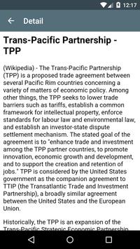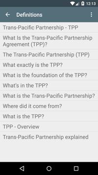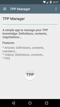 A simple app to manage your TPP knowledge: Definitions, contents, negotiations... Features: * Articles: Definitions, contents, members... * Videos: Definitions, contents... * FAQ