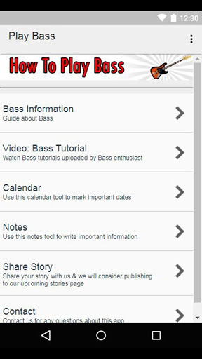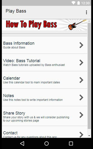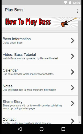 سوف تحصل على: معلومات BASS، فيديو من برنامج Bass Tutorial للمبتدئين، وكذلك العديد من الأدوات المفيدة مثل التقويم في التطبيقات والملاحظات.