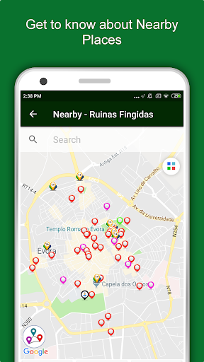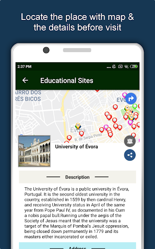 بصرف النظر عن هذا ، Evora Travel & Explore يرشدك لماذا، عندما وكيفية زيارة أماكن مختلفة في Evora مع موقع دقيق على الخريطة التفصيلية. هناك طريقتان لاستكشاف هذا التطبيق - عرض الفئة وإظهار الأماكن المفضلة Edubank. ضع وجهاتك واحصل على الطرق على الخريطة. ليس هذا فقط، يمكنك أن ترى بالضبط كيف تبدو الأماكن مع عرض الشارع المتكامل في هذا التطبيق. يحتوي التطبيق أيضا على ميزة لتقييم وكتابة المراجعة / الخبرة فيما يتعلق بالكيان (ق) من خلال تسجيل الدخول. ستساعد تجربة السفر والتقييم في مجتمع المستخدمين.