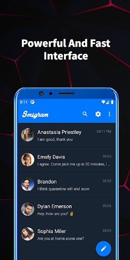 رسول SMSGRAM قوي وسريع.واجهة سهلة الاستخدام فائقة تشبه Telegram ستجعل اتصالك عبر الرسائل القصيرة ممتعة.يتضمن التطبيق أيضًا العديد من الميزات الفريدة.