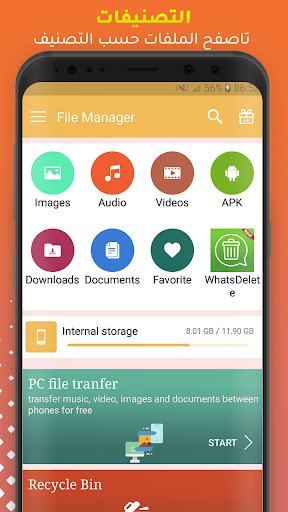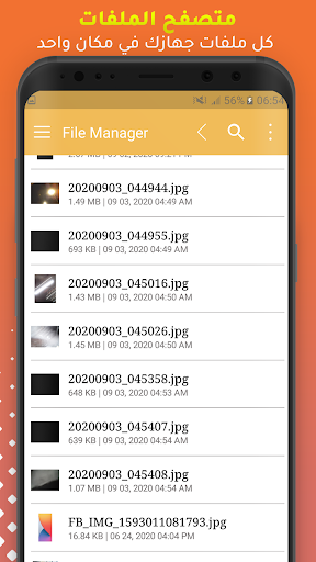 مدير الملفات هو مستكشف ملفات سهل وقوي لنظام اندرويد. قم بإدارة ملفاتك (مدير الملفات) كما تفعل على سطح المكتب أو الكمبيوتر المحمول باستخدام التحديد المتعدد ، القص / النسخ / اللصق ، النقل ، الإنشاء ، الحذف ، البحث ، إعادة التسمية ، المشاركة ، الإرسال والإشارة المرجعية.
