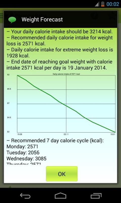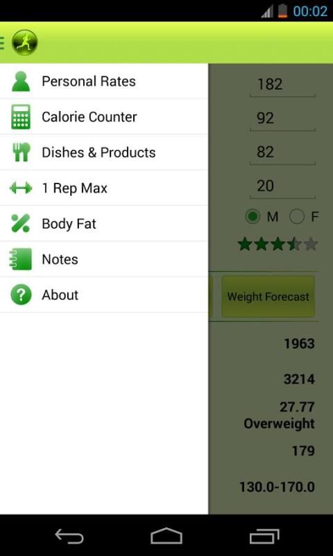 * معدلات الشخصية (BMI، RMR، السعرات الحرارية اليومية وكمية المياه، والحد الأقصى لمعدل ضربات القلب، والتدريب معدل ضربات القلب، وتتضمن أيضا توصيات وتوقعات الوزن في المستقبل)؛