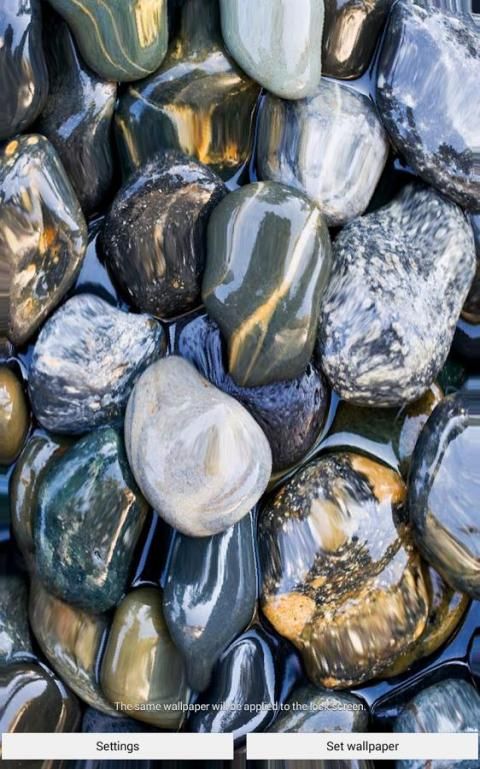 الانتظار لا أكثر، تحميل "حجر في المياه لايف للجدران" والتمتع بجميع أنواع الحصى على الشاشة. هذا التطبيق يشمل الحصى البيضاء التي تقدم نظرة نظيفة وطبيعية إلى أي شاشة. سوف الحصى مصقولة سوداء إضافة لمسة عصرية على خلفية هاتفك. استخدام أفضل "خلفية حية" والصورة حصاة المفضلة لتزيين الشاشة.