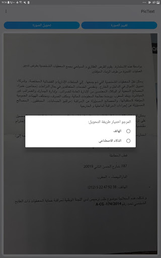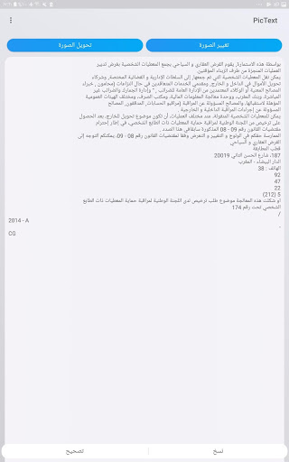 التطبيق يحتوي على ميزتين لاستخراج النصوص، الاولى تعتمد على الموارد الموجودة في الهاتف، والثانية تعتمد على استخراج النص عن طريق الخادم، وبالنسبة للغة العربية فيفضل استخدام الطريقة الثانية لان الاولى في الغالب لا يقدر اللوغاريتم على التعرف على الحروف العربية.