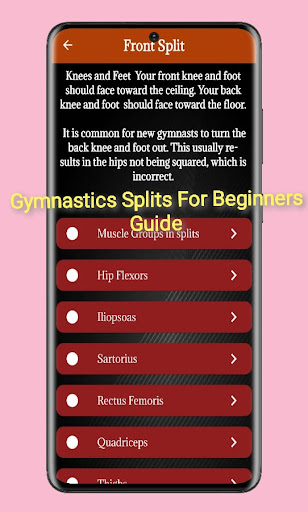 Gymnastics Splits Training Guide ‏This app is a great starting place to gain an understanding of how to perform splits. It is designed for use in the gym or at home, and for coaches, parents, and gymnasts. Gymnastics Moves Guide Splits are all about flexibility, and it takes a great deal of training to become flexible enough to execute them. This flexibility is achieved by doing different types of stretches that focus on the hamstrings,Gymnastics Splits For Beginners Guide‏ quadriceps, thighs, and hip flexors. Your warm-up will include a lot of stretching exercises that will help you become flexible enough to execute splits. Splits are used not only in gymnastics but also in dancing, cheerleading, martial arts, Gymnastics Moves Guide‏ synchronized swimming, and more. Let’s begin your journey into learning about splits and the basic skills required to execute them.
