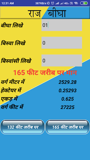 राज बीघा एप्लिकेशन के माध्यम से आप राजस्थान राज्य मे प्रचलित बीघा, बिस्वा एवं बिस्वांसी के मान को वर्ग मीटर, हेक्टेयर,एकड़ एवं वर्ग फीट मे परिवर्तित कर सकते है ।