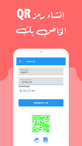 ولكن هذا ليس كل شيء، يعمل تطبيقنا أيضًا كماسح: مما يتيح لك مسح رموز الاستجابة السريعة لشبكات الواي فاي الموجودة حولك، والاتصال بشبكات الواي فاي الجديدة بدون أي مشاكل. بالإضافة إلى ذلك، يتيح لك مولد رموز الاستجابة السريعة الخاص بنا بدون كلمة مرور مشاركة شبكة الواي فاي مع الضيوف أو الزوار.