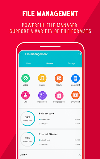 File Manager Browser can work effectively with rich types of files, like DOC, PDF, MP4, WMA, RAR and ZIP files. Also, it supports each file management actions (open, analyze, clean & boost, search, navigate directory, copy, paste, move, delete, rename, compress, decompress, transfer and share files). Organize your files in high-efficiency. Also, you can manage your apps installed on your phone