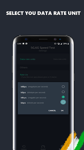 5G اختبار السرعة هو متر مجانا سرعة الإنترنت.يمكن اختبار السرعة مقابل 2G، 3G، 4G، 5G، 6G، الألياف، النطاق العريض DSL، و ADSL - ميزات: