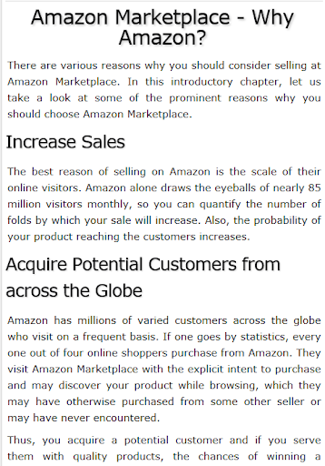 Amazon Marketplace Quick Guide - Learn Amazon Marketplace in simple and easy steps starting from basic to advanced concepts with examples including Why Amazon?, The Amazon Advantage, Types of Account, What to Sell?, Product Listing, Fees, Account Setting, Buy Box, Shipping Methods, Listing a New Product, Pricing Tools, Get Highest Profit, Price Calculator, Tax Handling, Shipping Process, Amazon Seller Central, Managing The Inventory, Creating Reports, Managing Reviews, Your Amazon Rating, Selling in Bulk, Best Practices, Troubleshooting Problems, Important Terms.