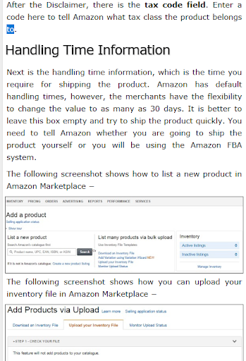 Amazon Marketplace Quick Guide - Learn Amazon Marketplace in simple and easy steps starting from basic to advanced concepts with examples including Why Amazon?, The Amazon Advantage, Types of Account, What to Sell?, Product Listing, Fees, Account Setting, Buy Box, Shipping Methods, Listing a New Product, Pricing Tools, Get Highest Profit, Price Calculator, Tax Handling, Shipping Process, Amazon Seller Central, Managing The Inventory