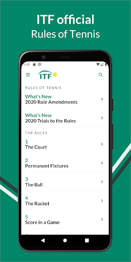 القواعد النهائية لمباراة التنس، على النحو المحدد من قبل الاتحاد الدولي للتنس، الهيئة الحاكمة في جميع أنحاء العالم للرياضة.يوفر التطبيق معلومات أساسية عن كيفية تشغيل اللعبة، ويوصى به للجميع المشاركين في التنس، من اللاعبين ومالكي النادي والمدربين إلى مديري البطولات والمسؤولين.يتضمن مواصفات للمحكمة والمضرب والكرة، وكذلك معلومات حول ملموسة ملعب تنس.يتضمن التغييرات الأخيرة في القواعد، وكذلك تجارب القواعد الجديدة التي تمت الموافقة عليها من قبل قواعد لجنة التنس في الاتحاد الدولي للاتصالات.