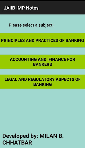 تم تطوير التطبيق بواسطة Milan Chhatbar الذي اجتاز الجايب وكذلك امتحان Caiib مرت أيضا من خلال تجربة وتتبع هذه الموضوعات.